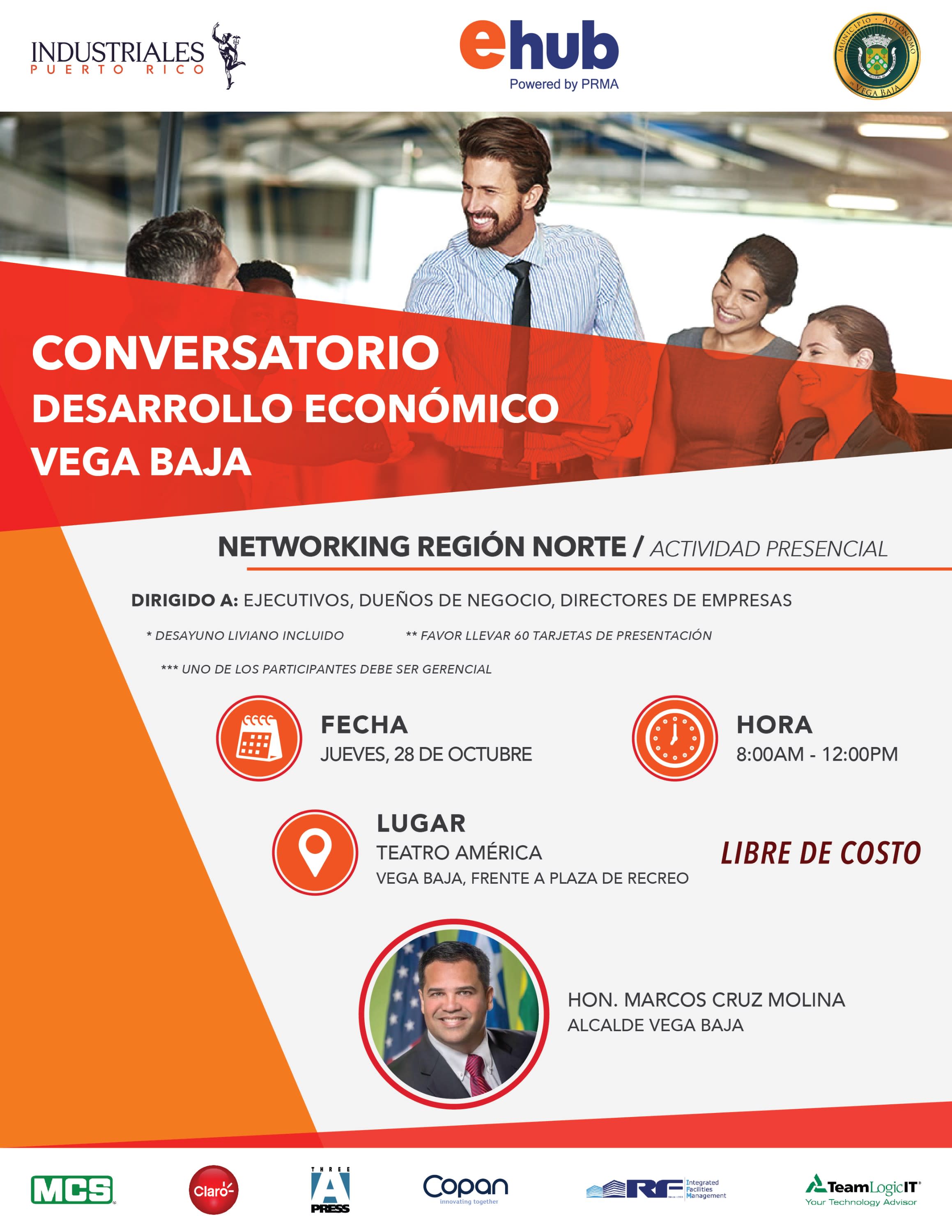 El Director Regional de Norte, Abimael Padilla, te invita al Networking/ Conversatorio con el Alcalde de Vega Baja, Hon. Marcos Cruz Molina